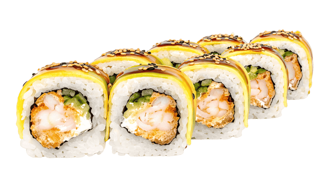 Насолодіться неймовірним контрастом текстур із нашим ролом Магуро. У його серцевині ви знайдете хрустку креветку в темпурі, поєднану з шовковистим ніжним сиром «Філадельфія», свіжим огірком та оксамитовим авокадо. Рол политий багатим соусом унагі для легкої солодкості та посипаний міксом чорного й білого кунжуту. Це ідеальне поєднання теплої хрусткої начинки та свіжої оболонки.
